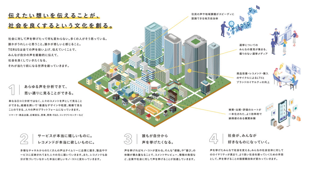 主力プロダクトである TERUS(本音がわかるAI分析プラットフォーム) は、顧客や従業員からの声を迅速に収集・解析し、保有データと組み合わせて、リアルタイムで洞察/分析結果を提供することで、企業の意思決定を根本から変革し得るポテンシャルを秘めていると思っています。